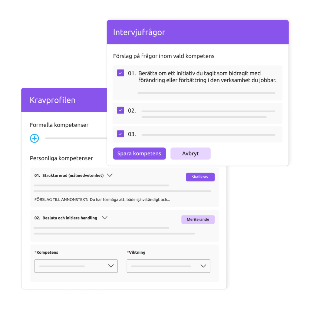 Att jobba med en kravprofil underlättar för att genomföra en kompetensbaserad rekrytering. I Talent Hire går det att skapa mallar och färdiga kravprofiler för de roller som man oftast rekryterar till. Du väljer vilka formella kompetenser som krävs för rollen. Med hjälp av ett kompetensramverk finns det färdiga intervju- och referensmallar som du såklart kan anpassa efter era behov.
