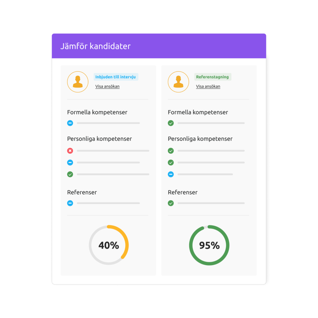 När vi har utvärderat vilka som är våra slutkandidater kan vi enkelt jämföra dem. Du får upp kandidaterna sida vid sida och ser hur varje enskild kompetens är utvärderad samt hur många procent av kravprofilen som de matchar. Har vi från start skapat en bra kravprofil så blir jämförelsen enkel och du kan med trygghet ta rätt beslut för vem du ska anställa.
